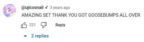 I.. did not expect to see Ujico (aka Snail’s House) in the comments section of the LIVE at Digital Mirage Set. Ujico! Of Hot Milk and Grape Soda fame! Ujico dominated the Kawaii Future Bass genre in the mid-2010’s, sharing anime-aesthetics with lofi-hiphop. I’m a bit sad that lofi seems to have outlived Kawaii Future Bass, it was unhinged fun in an entirely different lane than G Jones’ grim bangers.
