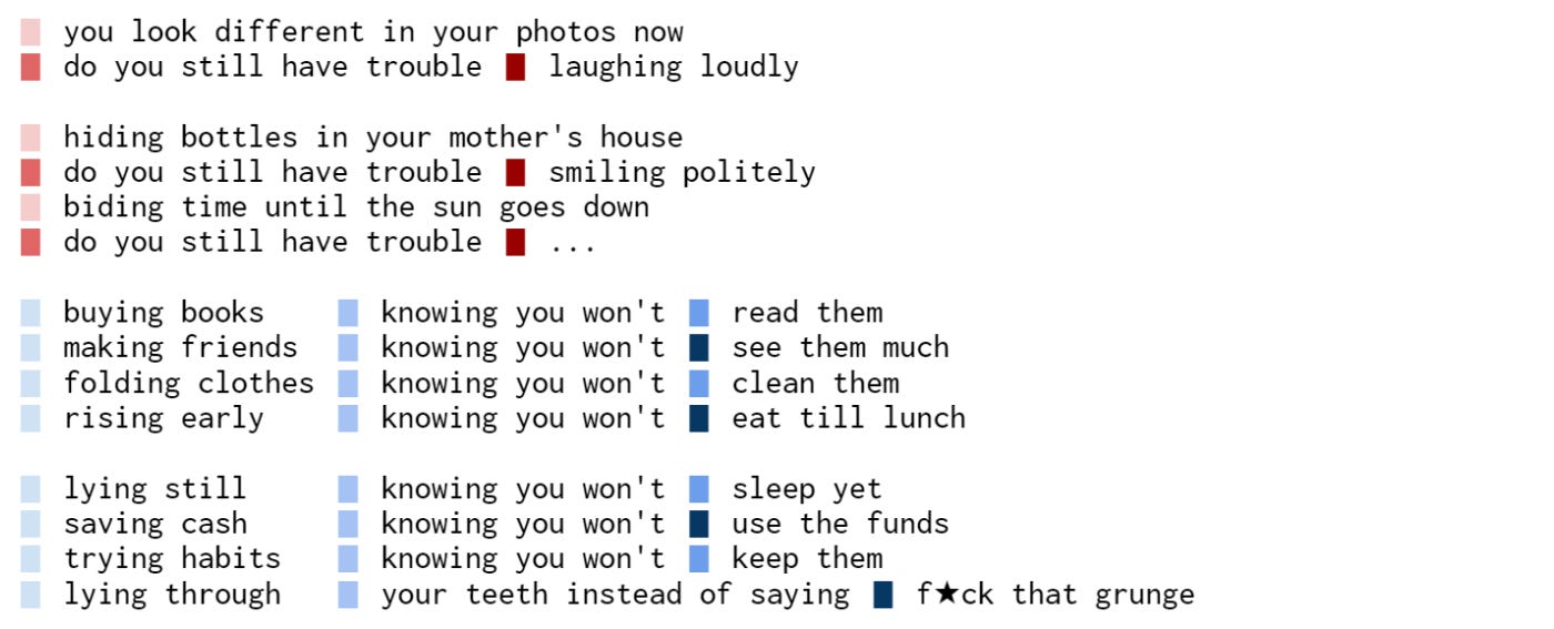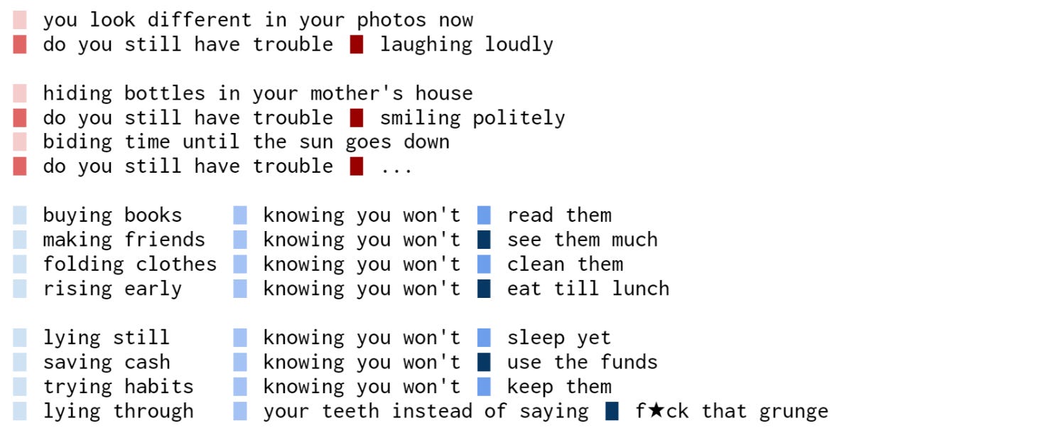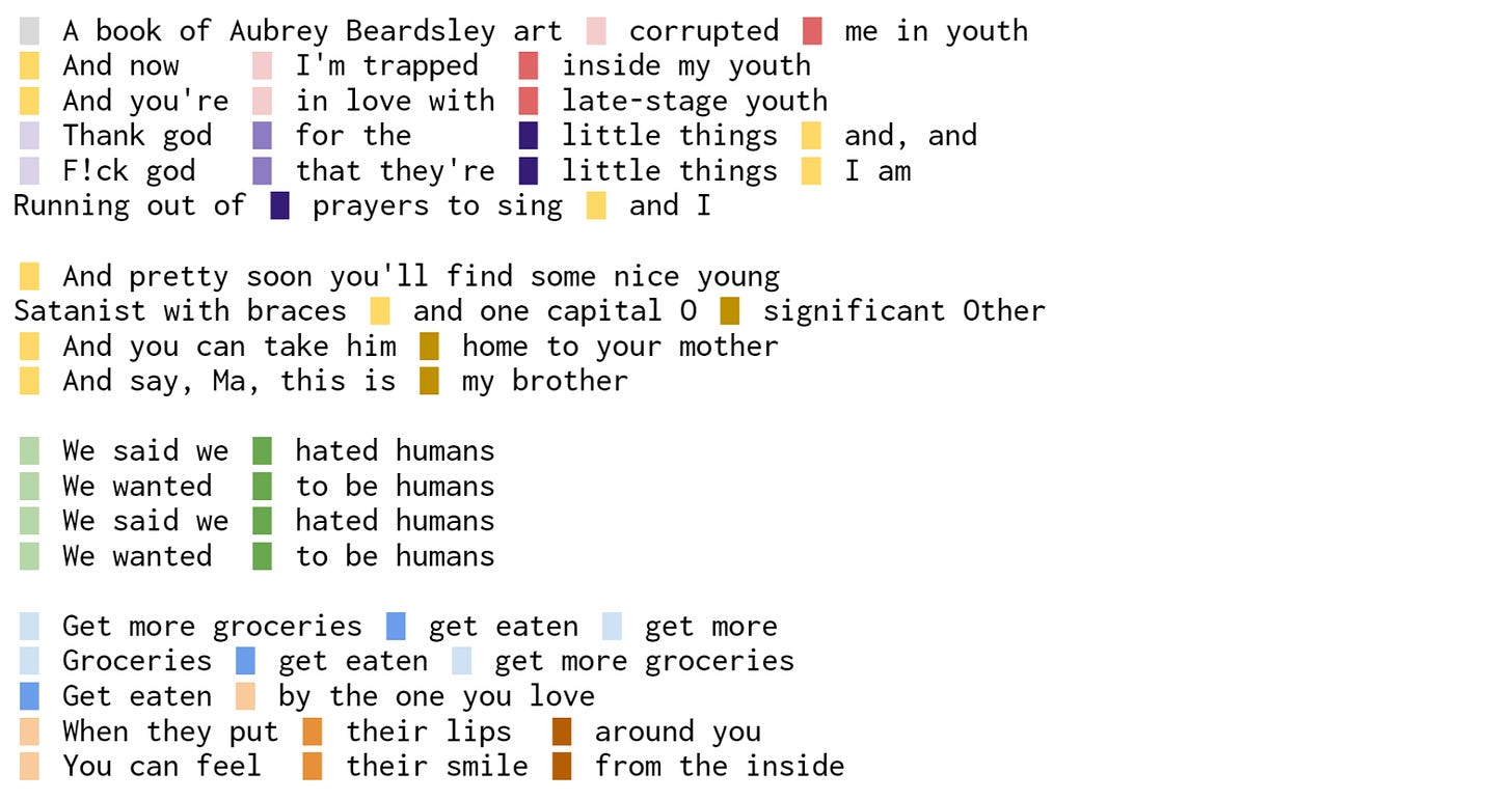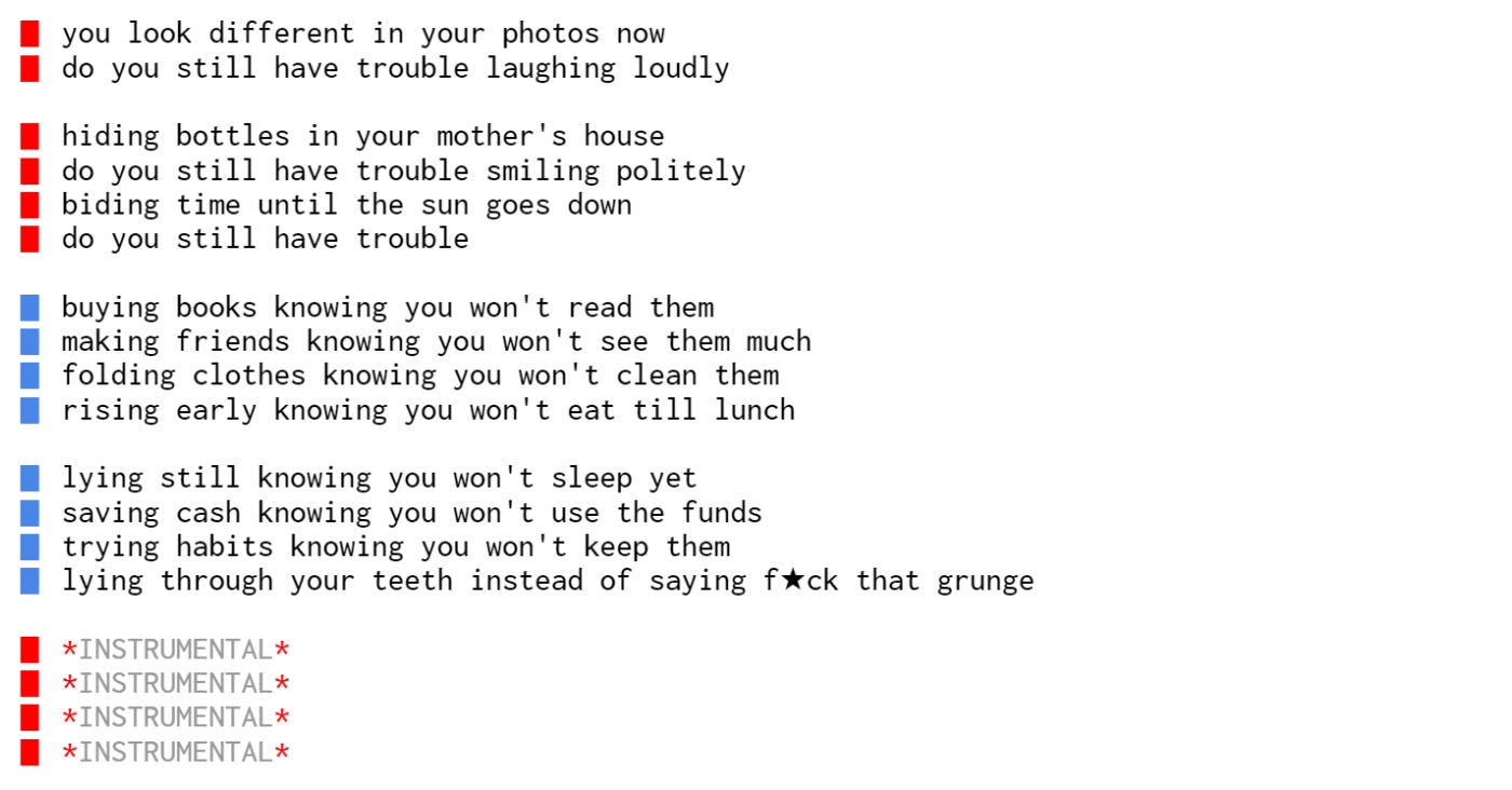 Now, reframing songs this way is only be helpful if it gives us new information. So what we can learn from splitting the lyrics to no, f!!ck all that into blocks?