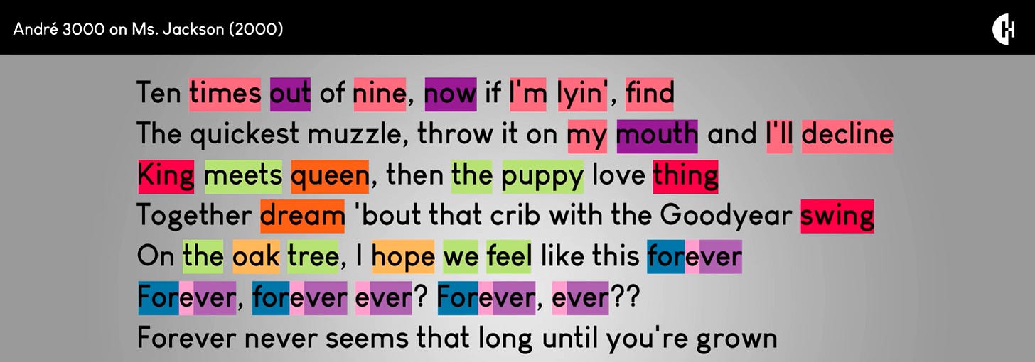 This is heavily inspired by a fantastic genre of videos highlighting rhymes and structure in rap music, see André 3000’s verse on Ms. Jackson for a great example!